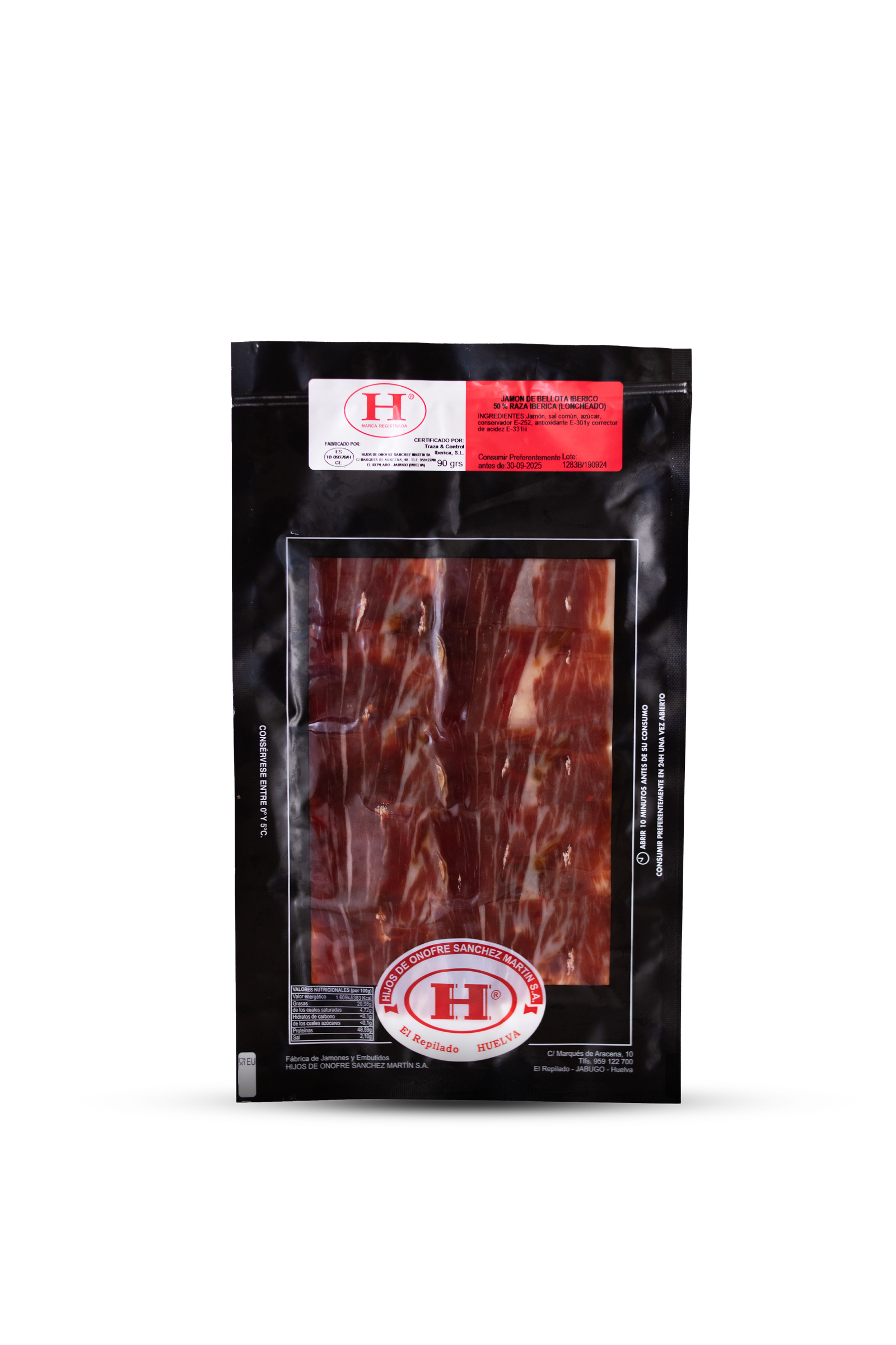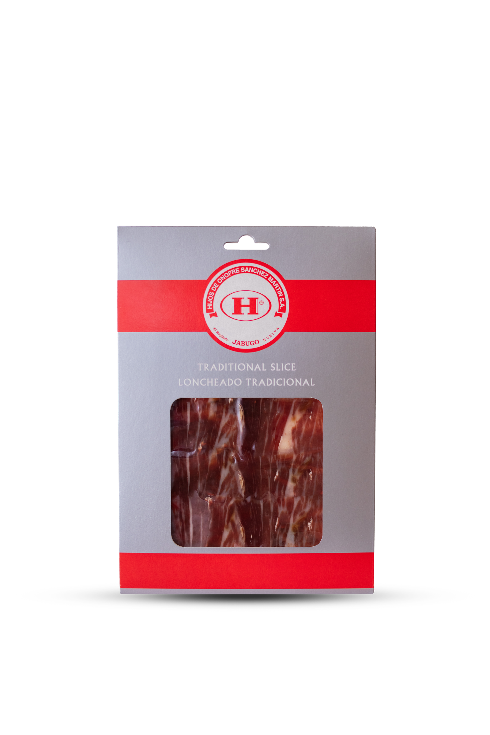 Sobres de 100 gramos de jamón cortado a mano y envasado al vació, procedente de cerdos ibéricos, seleccionados y criados en nuestras dehesas en régimen de extensivo con una alimentación 100% natural y con bellotas en la época de montanera. La curación de este producto, en nuestros secaderos y bodegas naturales oscila entre 32 y 40 meses dependiendo del tamaño de cada pieza.